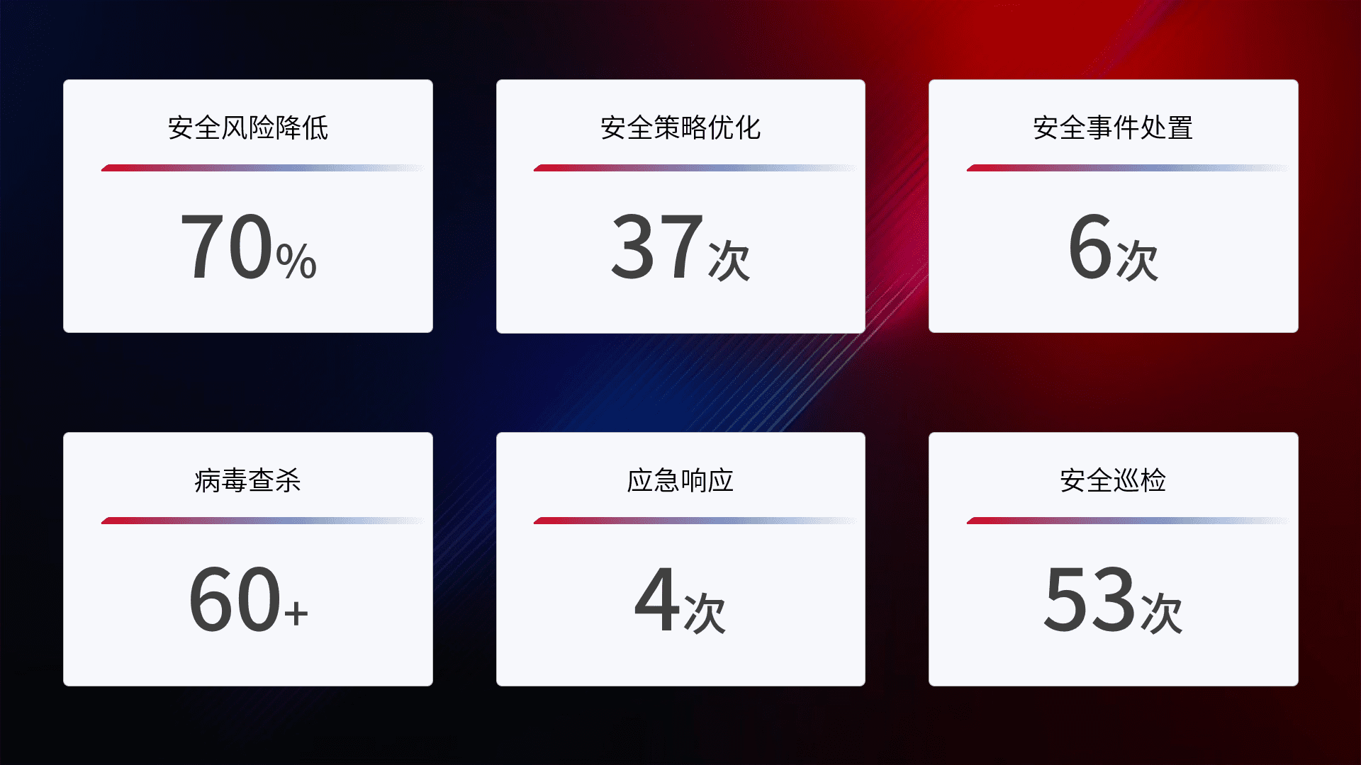 提供全面的安全事件报告体系,,,,包括处置报告、、、周报、、季度和年度总结,,,,结合持续监控,,帮助客户深入了解网络安全状况。。。